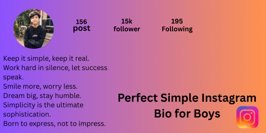 So, A perfect simple boys’ Instagram bio is about balance. Write less, accurate and has meaning.Instead of using complex quotes and emojis, focus on expressing your true character in sharp words.KISS. Simplicity is more likely to endure and leave a formidable impression in people.The real beauty of a good bio is that it introduces who you are, your preferences and beliefs in life. Without looking contrived. make it stand out by adding a touch of humor, one line motivation or stylish way of expressing expressions. Because the least is the most, the key is to keep it clean, natural and authentic and to ensure that your style matches the overall appeal of your page.