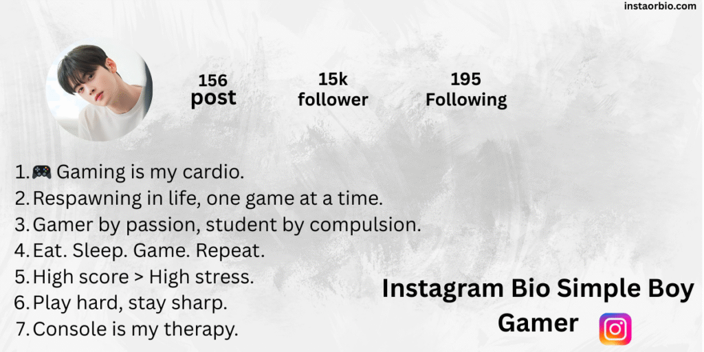 If you are a boy who loves gaming then theres love for us on Instagram bios everything virtual,your soul should be reflected in one sentence. This bio doesnt need to be too complex, A few catchy lines is enough. For example,”Eat.”Sleep”.Game.”Repeat.; “Gamer by heart,student by fate “is likewise acceptable. Adding gaming-related emojis such as this makes the bio more appealing and trendy. no matter if it’s mobile games, computer gaming or gaming consoles–it fits short and fun with your dedication to gaming! A gamer boy’s bio is all about skill, mood and never ending excitement.